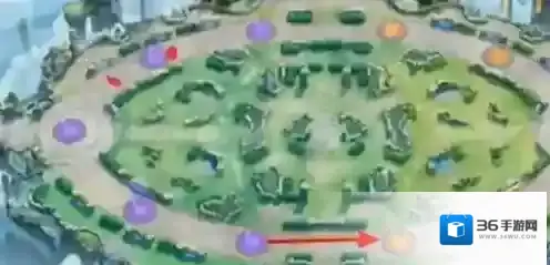3、让队友站至图中的红色方框处,并且抢夺该处的野怪,之后再去箭头处投分。