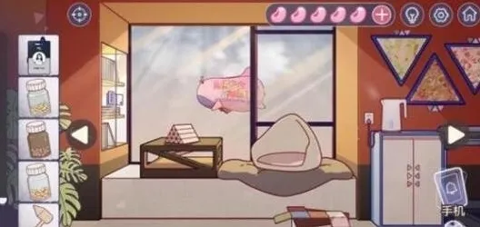 4、窗外飞机上有(灰紫、蓝、粉红(下上下))的密码提示,点击旁边墙上的画框选择对应的颜色得到密码439,前往安婕的衣柜下方的小盒子输入密码,得到药瓶2和三角形柜门按钮1。