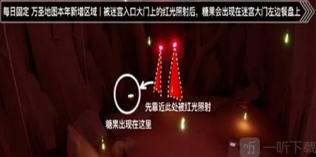6、第六个也是每天固定的位置,万圣地图本年新增区域,被迷宫入口大门上的红光照射后,糖果会出现在迷宫大门左边餐盘上。