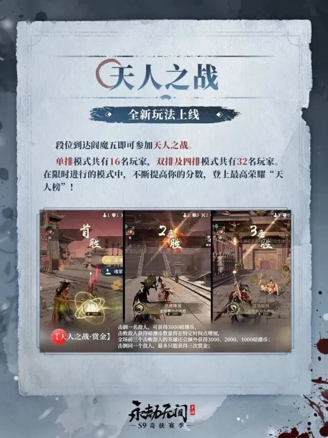1、新模式天人之战即将上线!段位到达阎魔五即可参加天人之战。