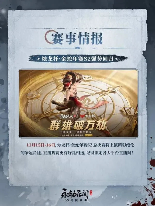 1、烛龙杯·金蛇年赛S2强势回归,总决赛将在11月15日和16日举办。