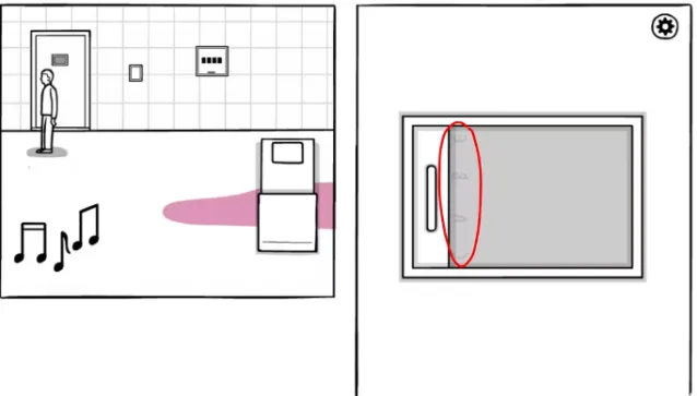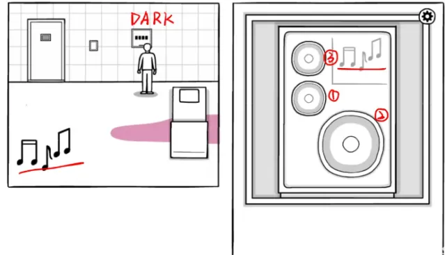 走到密码箱输入密码[DARK]。出现音箱,先按中间的喇叭,音符在房间左下角移动速度变慢的时候再点击一次,会让它停在那里;再同样的方法依次点击下面和上面的喇叭,让它们按照音箱上面的标识排列并停在房间左下角。