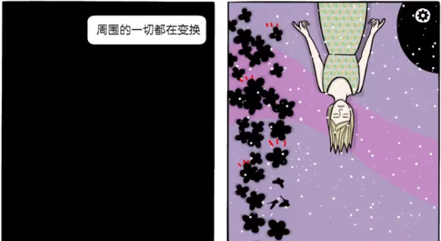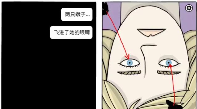 小黑继续向左走,看到Laura,向上移动眼皮睁开眼睛,旋转使之倒挂。