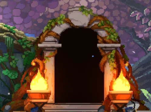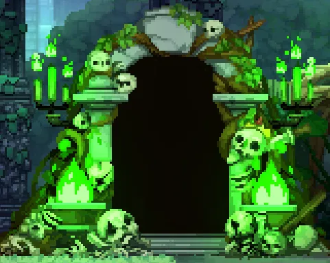 三种不同的门:绿门、普通门、宝箱门,分别表示下一个房间的通关奖励:绿门房间奖励头骨,普通门奖励金币,宝箱门奖励一件随机道具。前期推荐有绿门就选绿门,奖励的头骨不需要就分解成骨粉,用于之后升级头骨;没有绿门可以优先宝箱门,也可以根据自身需求选择。