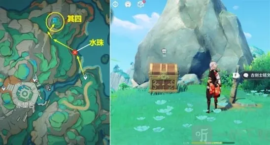 传送赤望台右侧锚点,用水珠飞上山,再前往山顶,即可找到[古剑士铭文·其四]。互动阅读即可。