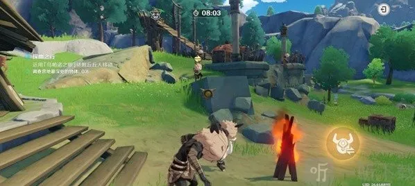「点击按钮」移动到树那边丘丘人头上然后点燃篝火