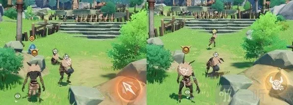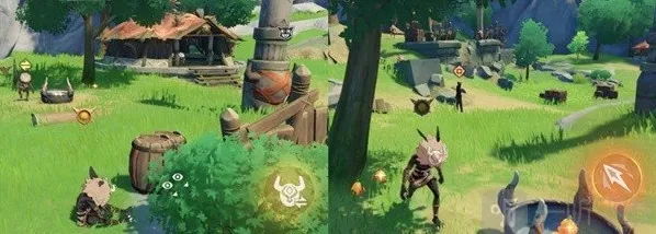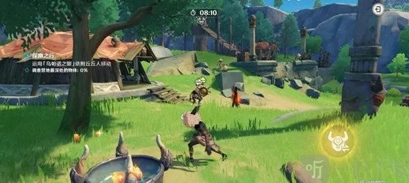 过来后「点击按钮」击打掉对面树上的日落果然后「点击按钮」移动到砸醒的丘丘人头上