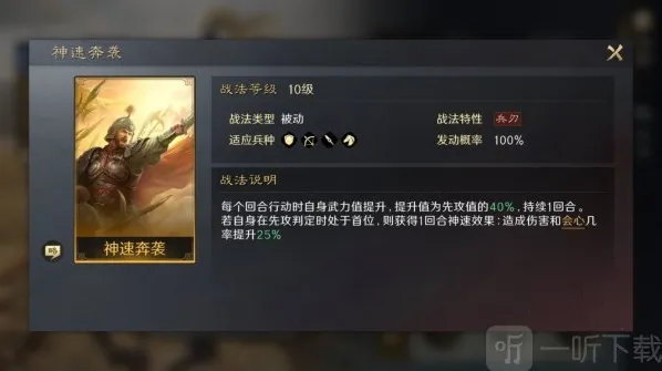 神速奔袭,被动战法,先攻越高,武力越高,战斗时若自身首位,先攻则额外增加伤害和会心几率。