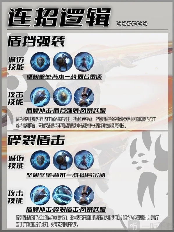 战盾是战士的坦克形态,通过高额的坦度来保证自身的生存空间,用来队伍吸引仇恨。让队伍成员有一个良好的输出空间。坦克职业对于控仇方面十分依赖战斗经验,需要注意站位和攻击释放时机。战斗中合理使用盾牌冲击来额外增加盾挡的效果持续时间来维持坦度,在开荒一些副本时治疗压力大,我们可以选择更换碎裂盾击,加强自己的回复能力。