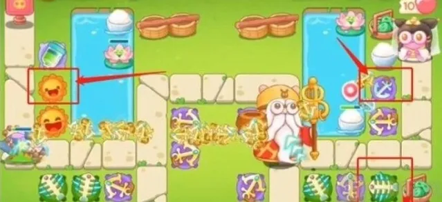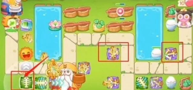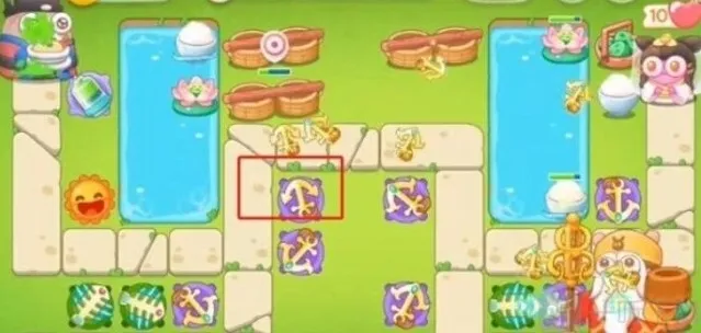 8、第八波右侧加一鱼骨头升一级,随后升满级,中间船锚升满级,左侧加一太阳花,右上角加一船锚。