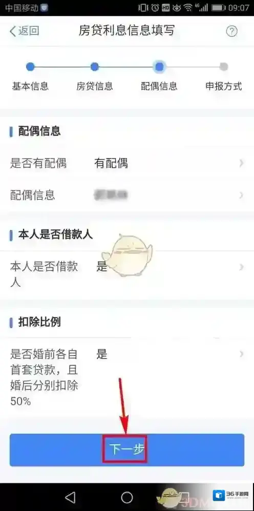 8、然后根据实际情况选择和填写配偶信息,以及本人承担的扣除比例。填好后,点击下一步。