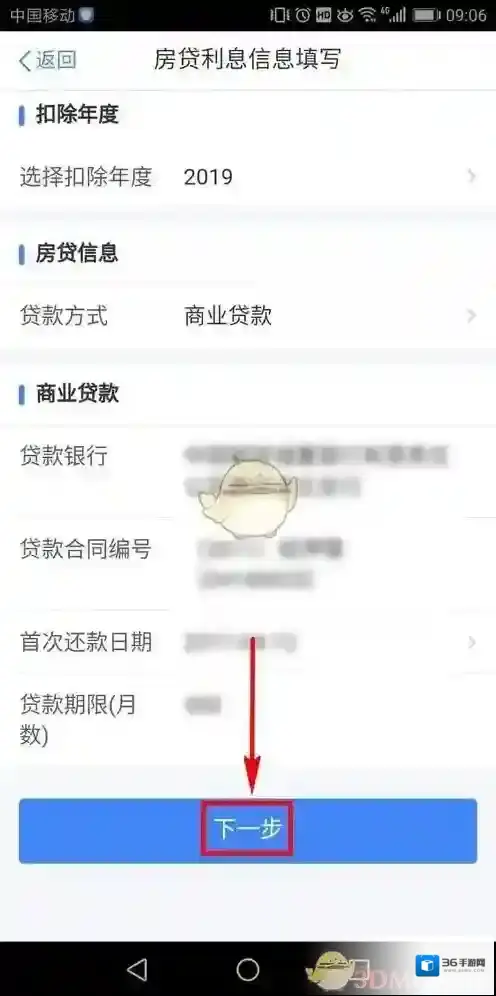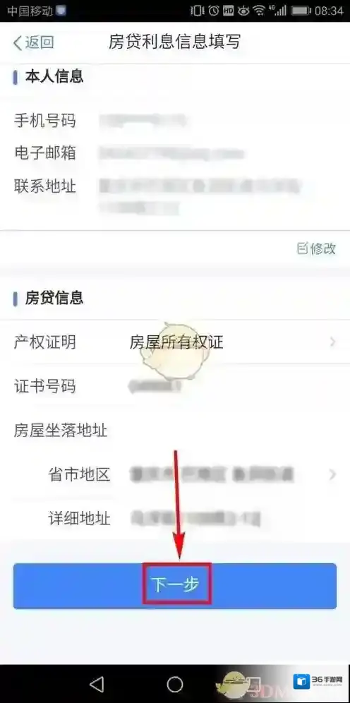 7、接着完善房贷合同等相关信息,注意这里的信息一定要看房贷合同上是怎么写的就怎么填,不要错字漏字。确认无误以后,点击下一步。