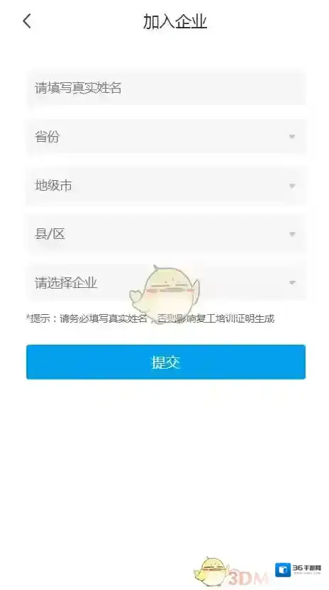 4、填写员工姓名,选择省份、地级市、县/区,选择企业,点击提交,即可加入企业。