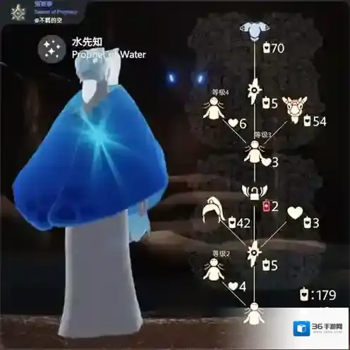3、点燃水先知开始飞行追随足迹,在预言山谷转一圈即可拿到深呼吸动作。