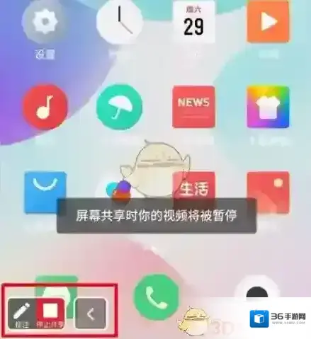 6、共享屏幕成功,在手机屏幕左下角会有个共享的设置按钮,此时参加会议的人员就可以看到你手机屏幕显示的内容。