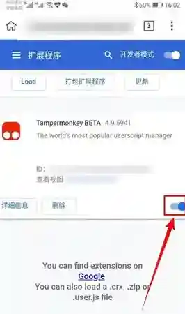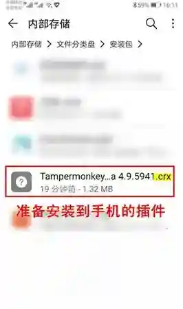 2、其次需要准备好要安装到手机上的.crx格式的扩展插件,插件可以在第三方插件网站下载,这里我下载了一个使用非常广泛的“Tampermonkey”插件来进行演示。