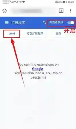 5、在打开的页面中,首先开启开发者模式,然后点击Load按钮。