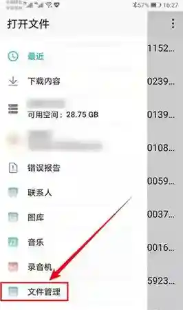 8、在弹出的“打开文件”侧边栏中,选择文件管理。