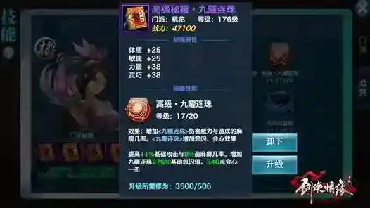 不管是什么门派,输出的基础就是攻击力,桃花也不例外。不难理解,如果攻击力过低,仅注重会心几率和会心伤害的提升,则缺乏输出的基础当然不会有好的效果。我在89级时把武器的紫色力量属性洗练成紫色灵巧属性,综合战力数值没有变化,但在与某武当的切磋中发现获胜的概率大幅下降。由此可以推断,弃攻击而取会心是不划算的取舍。从桃花的技能介绍来看,仅高级秘籍九耀连珠有增加会心一击的加成描述,其余均没有对会心几率、会心伤害等的直观反映。