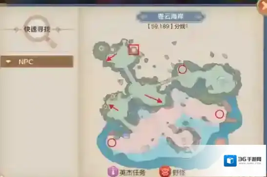 卷云海岸,去瞭望台方块标识那个地方,抽一次风铃,就可以接任务了,箭头标识是三个龙蛋的地方,圆圈标识是三个箱子的地方(完成卷云海岸英杰任务后,给的福利箱子)。