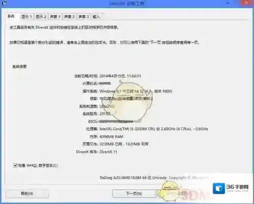 方法:通过单击“开始”按钮,在“搜索”框中键入 dxdiag,然后按 Enter,打开“DirectX 诊断工具”。