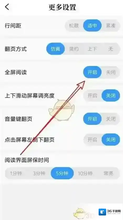 5、最后打开更多页面,选择全屏阅读设置项后面开关,选择开启按钮即可。