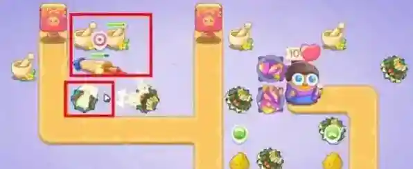 4.红框位置处建造一个顶级多重箭,锁定左侧的捣药碗,打掉后再锁定上方的雨伞,利用多重箭的特性,可以打掉宝箱。