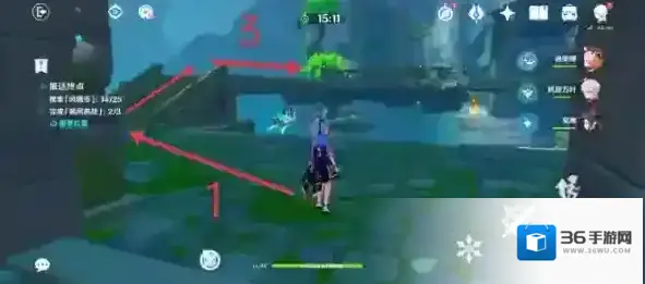 3.来到任务指引位置,清理怪物拿完风循币后,原路返回到台阶下。并按照图示箭头顺序来到路的尽头。注意图中3处直走不要拐弯,走到尽头即可!