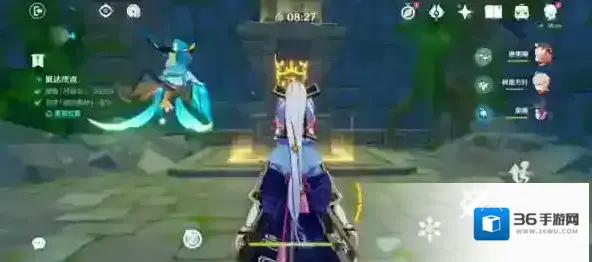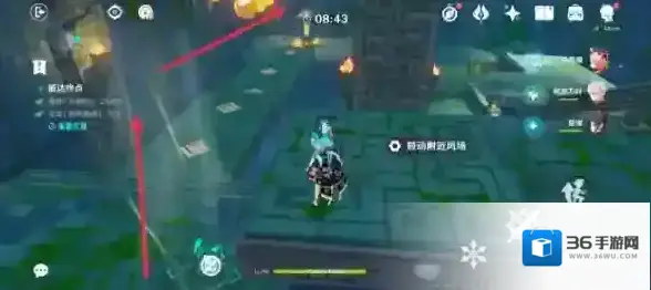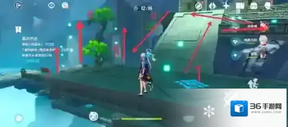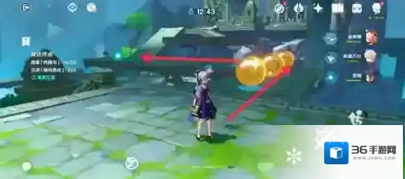 6.来到任务指引处,将左下方的风场方向朝上,并鼓动风场,按照图中箭头方向收集风循币并前进。