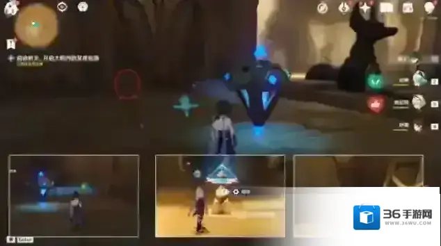 7.进来后,击打2下机关,把光线照到沙堆,沙堆消失,启动出现的机关开门。借助四叶印往下飞,来到任务地点,往里走,上楼梯(这里宝箱,神瞳啥的自己记得捡哈,因为与任务无关,所以我就跳过了哈~)