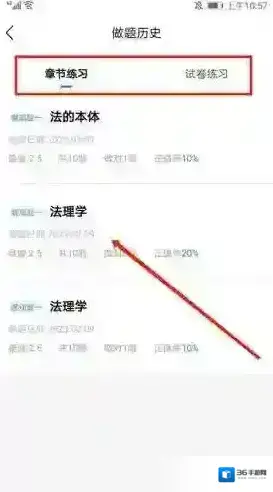4、进入做题历史界面,分为“章节练习”和“试卷练习”两大类,选择要查看的题目,这里以“法理学”为例(如下图所示)。