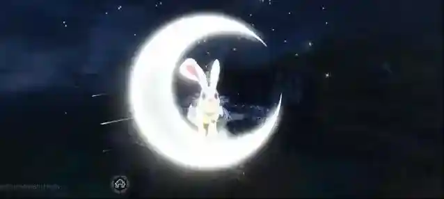 2. 依偎:玉兔与主人并排坐在月亮上,可骑乘移动,主角在上船时会触发语音