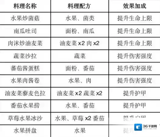 食谱分:共七种,分别为:弱辐射伤害、提升血量、提升伤害、伤害减免、回复饥饿、提升护甲、特殊料理等,具体效果如下。