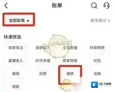 4、进入账单页面后,在全部账单里点击“退款”这一项进行筛选。