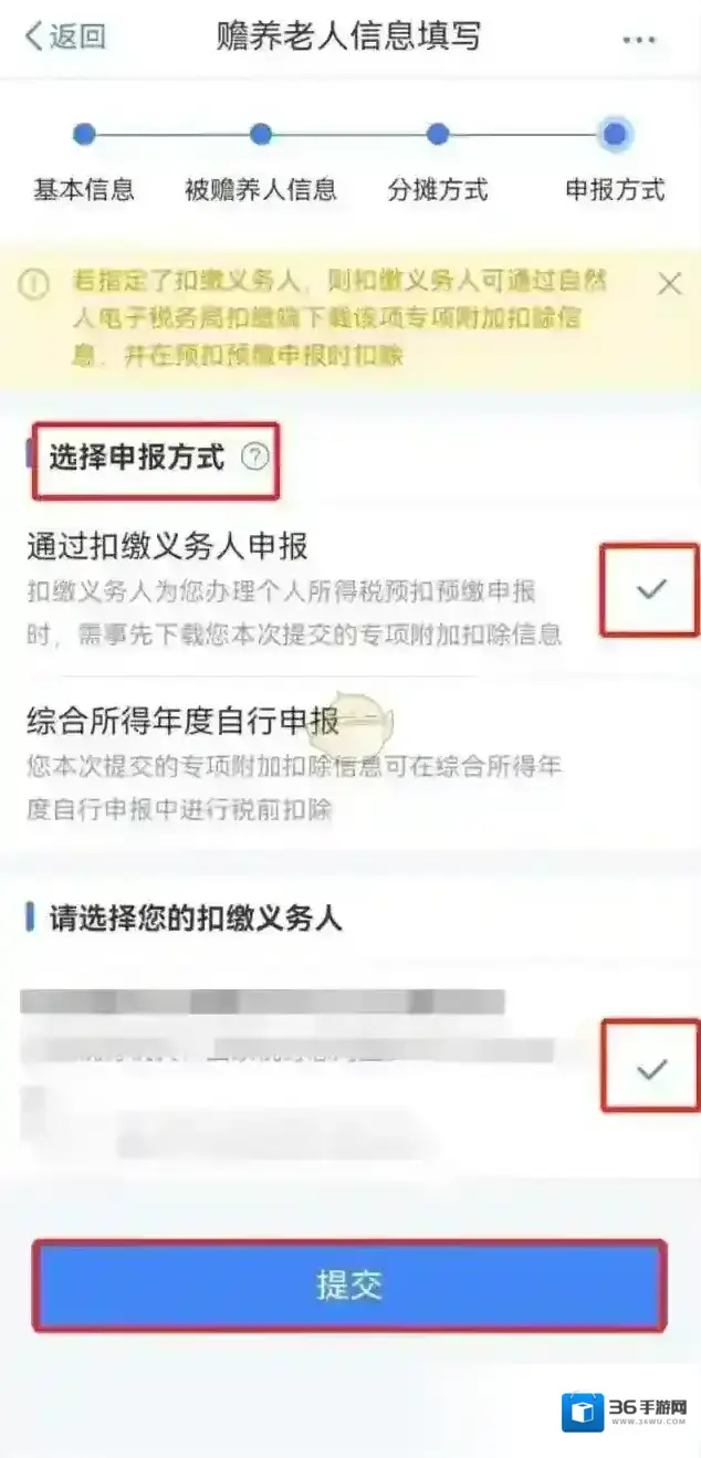 10、最后选择申报方式,选择“通过扣缴义务人申报”,随后选择您的扣缴义务人,点击“提交”完成操作即可。