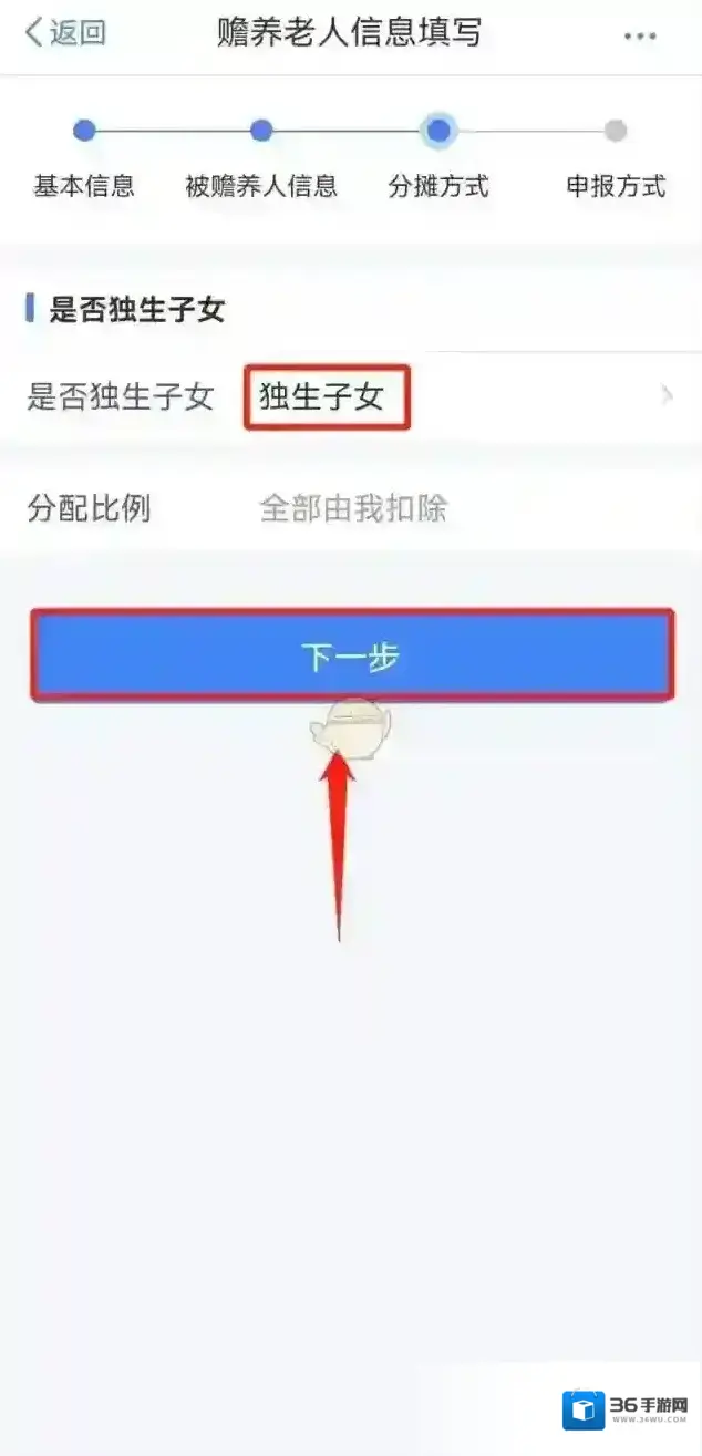 9、如果是独生子女的,点击“下一步”;若是非独生子女的,选择“分摊方式”和录入“本年度月扣除金额”,点击“下一步”选项。