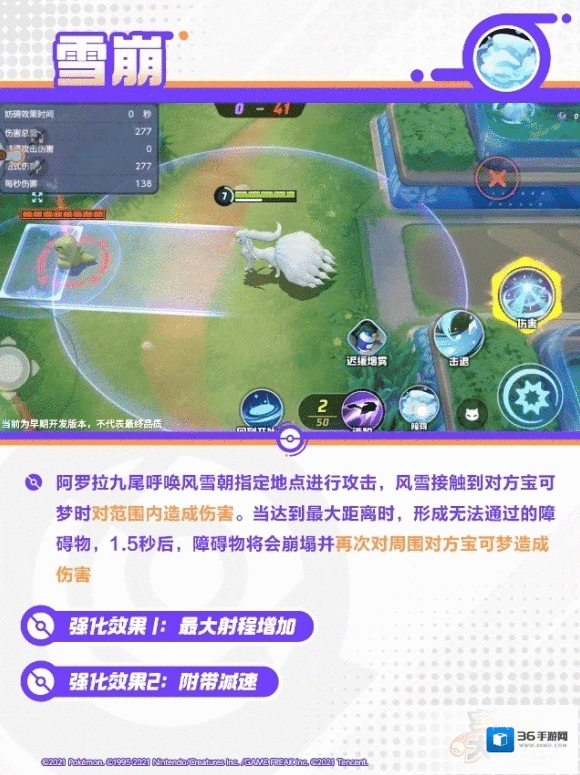 间接性地降下冰雪,对范围内的对方宝可梦造成伤害,并在0.8秒内对其造成减速效果。