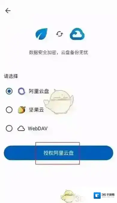 5、然后进入云盘授权界面,在这里选择其中一个云盘进行账号绑定即可,这样你的账单数据就会直接备份到云盘中,可以跨手机恢复备份数据,相比本地来说更加方便实用。