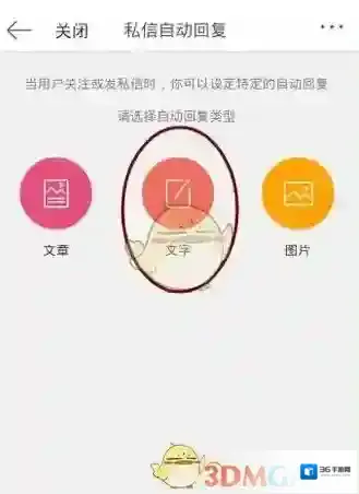 6、图中会显示自动回复文章、文字、图片三中类型,此处我们点击“文字”,其他类型的回复操作类似。