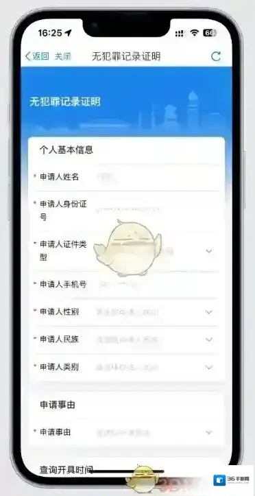 2、查询页面显示用户个人信息,点击下方“申请无犯罪记录证明”并进行人脸识别认证。