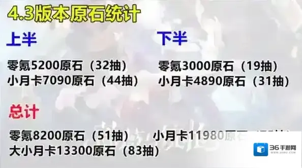 总计上下半加起来,4.3版本零氪玩家可得8200原石(51抽),小月卡玩家11980原石(75抽),大小月卡则是13300原石(83抽)。