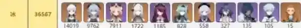 冰系虽然有11位角色,不过总的登场数居然是最低的,冰系角色的登场主要靠神里绫华、甘雨和迪奥娜贡献,剩下的角色都很少人用。冰系角色之所以登场数这么低,一部分原因可能是须弥版本冰草不反应,冰系喝不到汤。