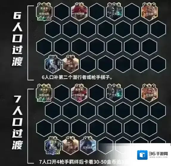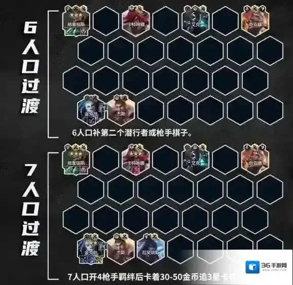 然后存钱存满50金币快速上6、7人口,6人口补第二个潜行者或枪手棋子,7人口开4枪手羁绊后卡着30-50金币追3星卡特、金克斯、艾克、杰斯。
