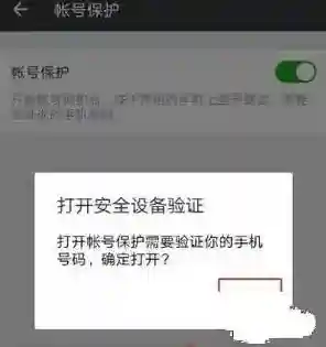 5、在帐号保护页面,可以看到没有开启。开启之后,会弹出“打开安全设备验证”的提示,“打开帐号保护需要验证你的手机号码,确定打开?”点击“确定”即可,如下图所示。