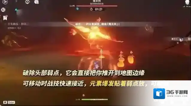 ②随后爆炎树会蓄力并推开周围角色,当气压结束战技连线史莱姆的同时奔向爆炎树,元素爆发强水可直接破除底部弱点;