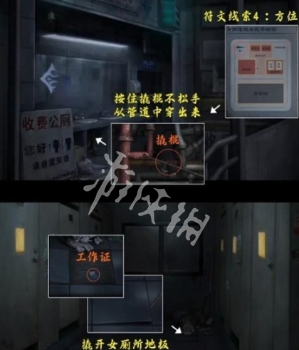 4、走出厕所,在桌子上得到方位线索就是左侧是北,这是符文线索4,在洗手池下面得到撬棍,可以打开女厕所的地板拿到工作证。