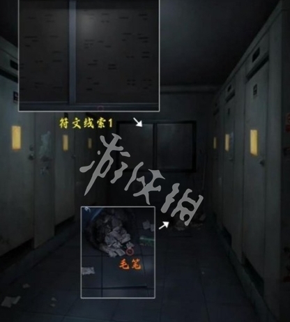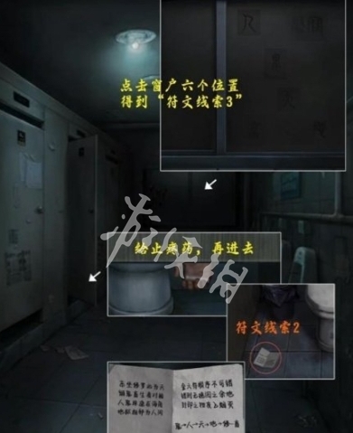 1、进入厕所寻找闺蜜,然后将窗户重叠可以得到符文线索1,然后再地上的垃圾桶里得到毛笔。