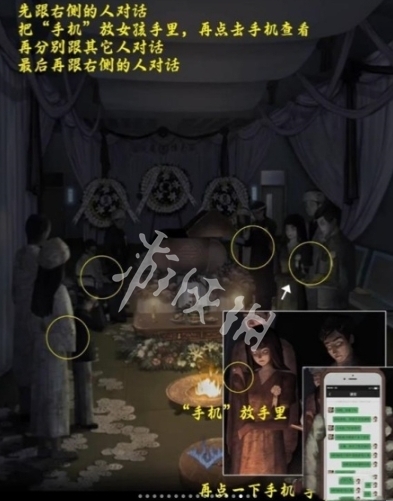 27、需要和葬礼右边的人进行对话,并将手机放在女纸人的手中就会收到微信,然后继续和右边的人进行对话,纸人就会扑过来。