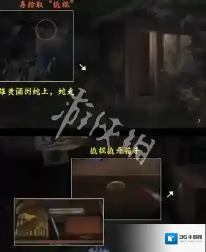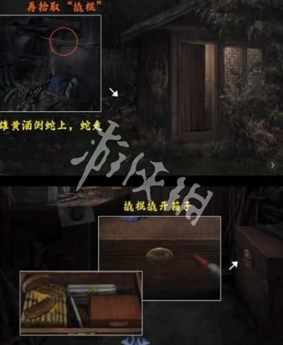 15、前往物资后面的杂物堆,将雄黄酒倒在蛇上面得到撬棍,然后打开屋里面的箱子就能得到木盒。