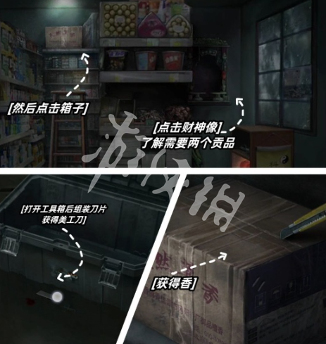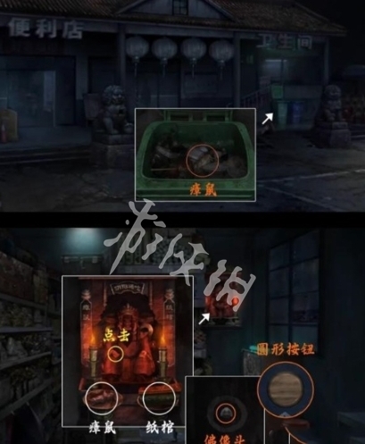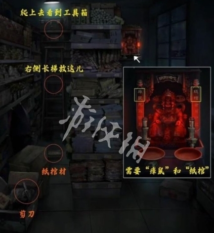 7、将便利店右边梯子放在左侧上去能看到工具箱,点击右侧的财神得知需要瘴鼠和纸棺,左侧的地上就有纸棺,门外的垃圾桶有瘴鼠。